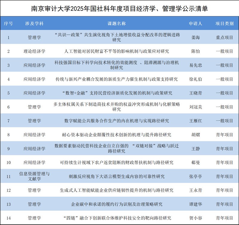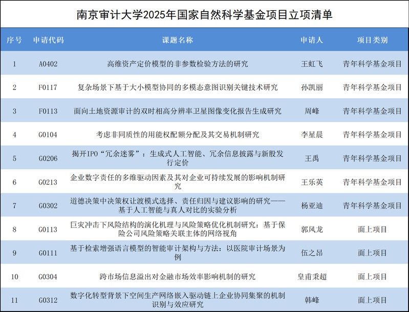另外,2025年国家自然科学基金立项情况,南京审计大学获批立项11项,其中青年科学基金项目7项,占比过半。学校始终注重青年学者的成长,不断为其发展营造更好的环境和生态,相信未来以青年学者为主体的南审人一定会在以审计为特色的各学科领域取得更好成绩。