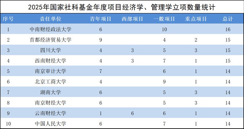 近日,全国哲学社会科学工作办公室对2025年国家社会科学基金年度项目立项公示,其中经济学管理学项目共1438项。从各单位经管类立项数看,中南财经政法大学共16项,位列第一;首都经济贸易大学、四川大学、西南财经大学各15项,并列第二;南京审计大学、北京工商大学、湖南大学、南京财经大学、云南财经大学、中国人民大学各14项,并列第三。